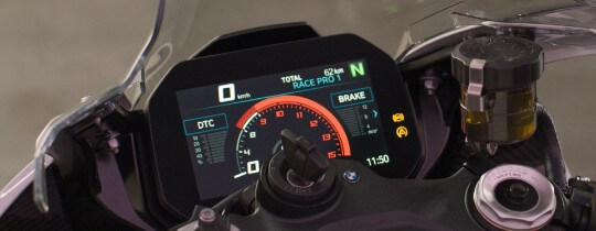 Desempenho na tela Indo para o pit lane depois de algumas voltas na pista de corrida: a última tela usada é sempre exibida depois que você desliga/liga a ignição. Isso ajuda você a se concentrar e permanecer focado na pilotagem. A tela Pure Ride e as três telas Race diferentes estão disponíveis dependendo da sua preferência. O sistema exibe uma rotação máxima adequada quando o motor está frio. O shift-light programável indica o melhor momento para as trocas de marcha. Graças ao painel TFT de 6.5", você pode visualizar rapidamente todas as outras configurações também.