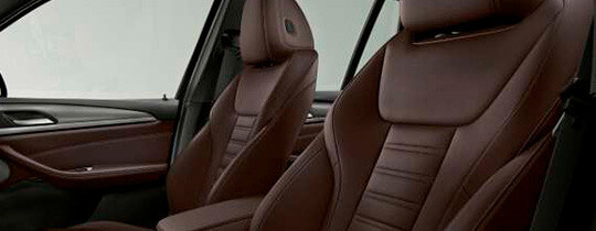 Bancos esportivos Os bancos esportivos, item padrão de série, garantem um alto nível de conforto ao interior do BMW iX3. Confeccionados em Sensatec, com fina granulação perfurada. O volante M em couro inclui múltiplas funções e o emblema M apresenta um design com 3 raios. Frisos interiores em Alumínio Rhombicle Dark, com detalhes esportivos adicionais.