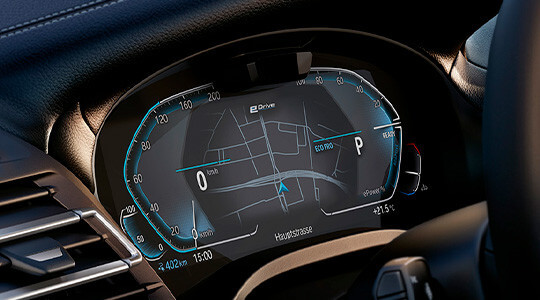 Cabine O BMW Live Cockpit Professional alia uma tela de instrumentos totalmente digital, de 12,3 polegadas, a uma tela de controle com função por toque. Os destaques em azul do BMW i no botão start/stop enfatizam o sistema de tração livre de emissões no novo BMW iX3