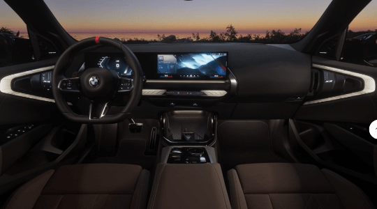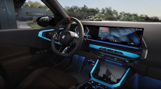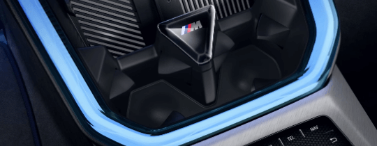 Uma pedra triangular com o logotipo M decora o compartimento de armazenamento iluminado no console central. Um pequeno, mas impressionante detalhe semelhante ao vidro.