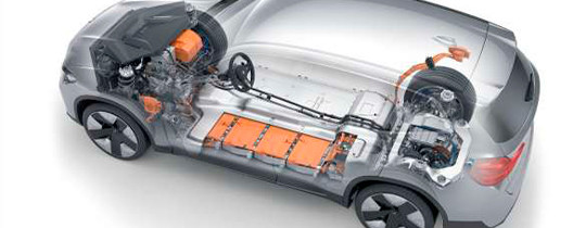 A unidade de tração elétrica, altamente integrada, combina um motor elétrico, a transmissão e a eletrônica de potência num compartimento em alumínio, economizando espaço e peso.